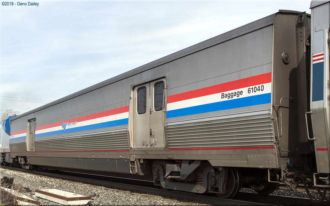 de Ferrocarrilesas) in Elmira Heights, NY in 2014 and numbered 61040. These cars were built to replace Heritage Baggage cars used systemwide and were all delivered in Amtrak's classic Phase III paint scheme while sporting the current Amtrak "Travelmark" Logo. Historical information about this car provided by www.amtrakbythenumbers.com. |
