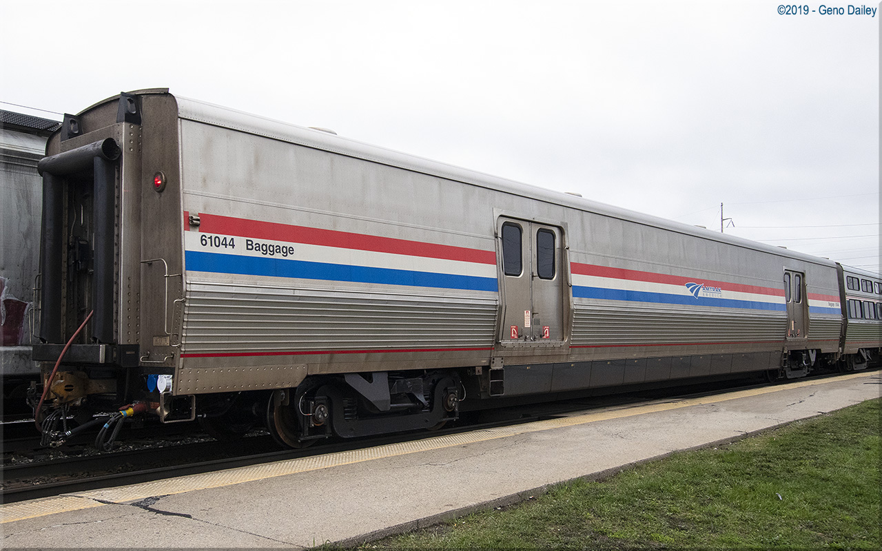 de Ferrocarrilesas) in Elmira Heights, NY in 2014 and numbered 61044. These cars were built to replace Heritage Baggage cars used systemwide and were all delivered in Amtrak's classic Phase III paint scheme while sporting the current Amtrak "Travelmark" Logo. Historical information about this car provided by www.amtrakbythenumbers.com. |