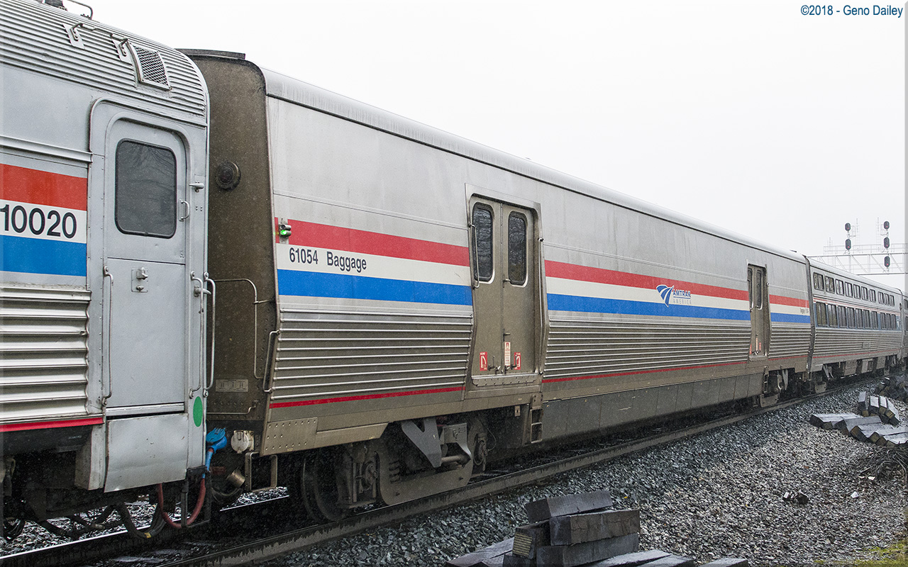de Ferrocarrilesas) in Elmira Heights, NY in 2014 and numbered 61054. These cars were built to replace Heritage Baggage cars used systemwide and were all delivered in Amtrak's classic Phase III paint scheme while sporting the current Amtrak "Travelmark" Logo. Historical information about this car provided by www.amtrakbythenumbers.com. |