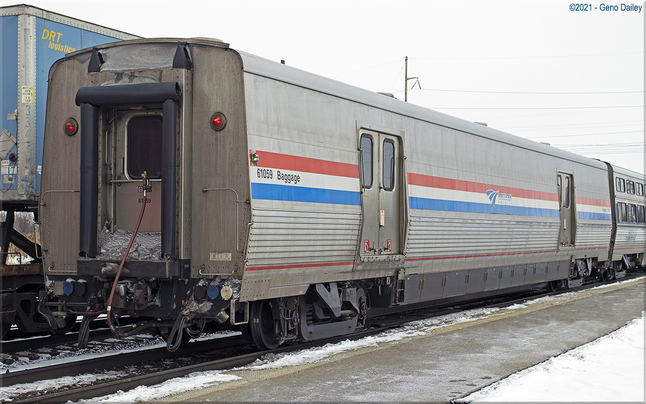 de Ferrocarrilesas) in Elmira Heights, NY in 2014 and numbered 61059. These cars were built to replace Heritage Baggage cars used systemwide and were all delivered in Amtrak's classic Phase III paint scheme while sporting the current Amtrak "Travelmark" Logo. Historical information about this car provided by www.amtrakbythenumbers.com. |