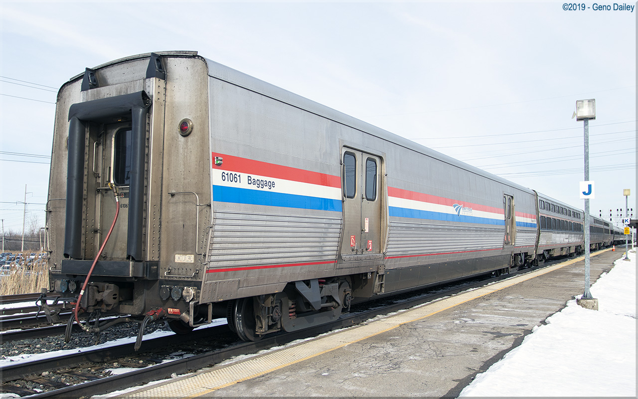 de Ferrocarrilesas) in Elmira Heights, NY in 2014 and numbered 61061. These cars were built to replace Heritage Baggage cars used systemwide and were all delivered in Amtrak's classic Phase III paint scheme while sporting the current Amtrak "Travelmark" Logo. Historical information about this car provided by www.amtrakbythenumbers.com. |
