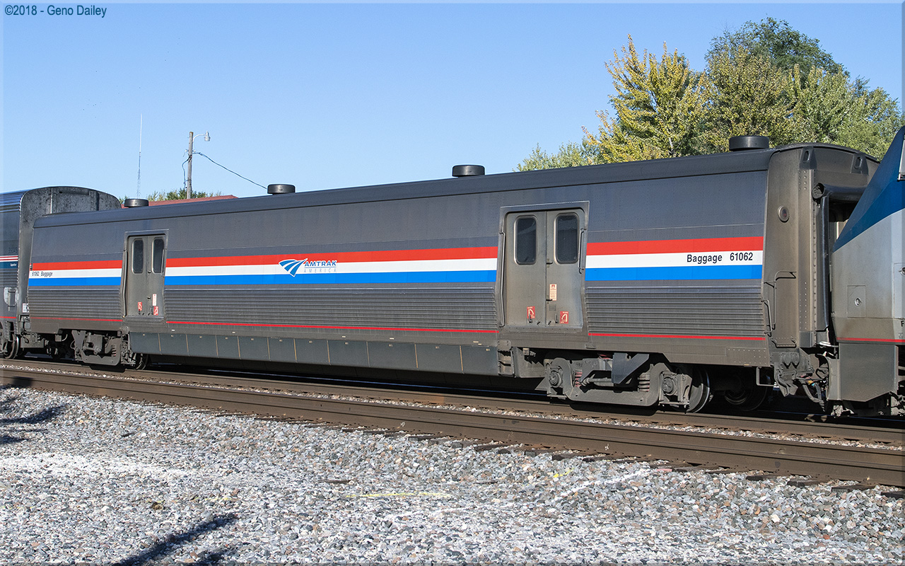 de Ferrocarrilesas) in Elmira Heights, NY in 2014 and numbered 61062. These cars were built to replace Heritage Baggage cars used systemwide and were all delivered in Amtrak's classic Phase III paint scheme while sporting the current Amtrak "Travelmark" Logo. Historical information about this car provided by www.amtrakbythenumbers.com. |