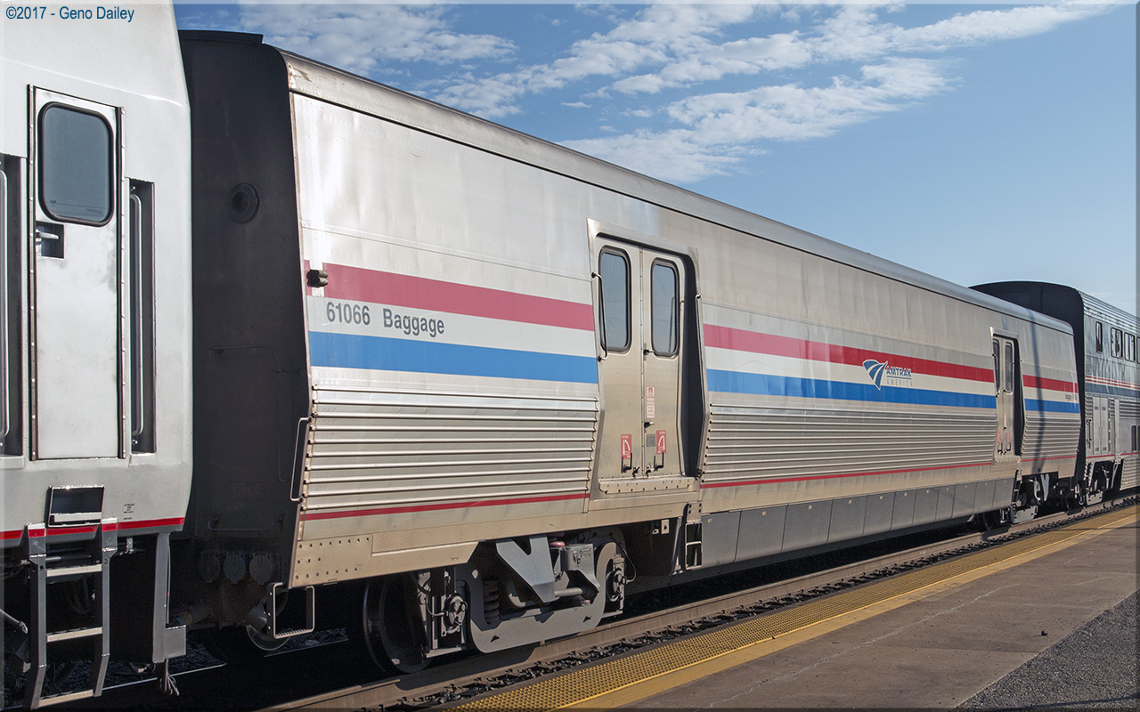 de Ferrocarrilesas) in Elmira Heights, NY in 2014 and numbered 61066. These cars were built to replace Heritage Baggage cars used systemwide and were all delivered in Amtrak's classic Phase III paint scheme while sporting the current Amtrak "Travelmark" Logo. Historical information about this car provided by www.amtrakbythenumbers.com. |