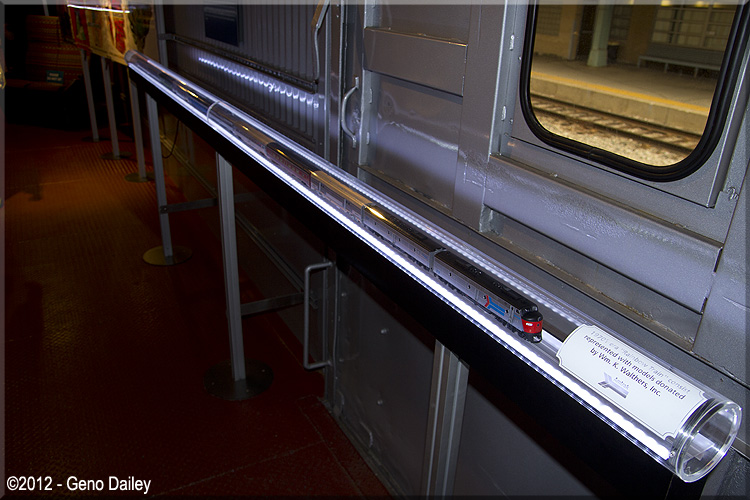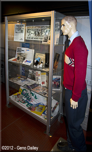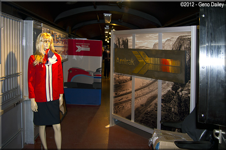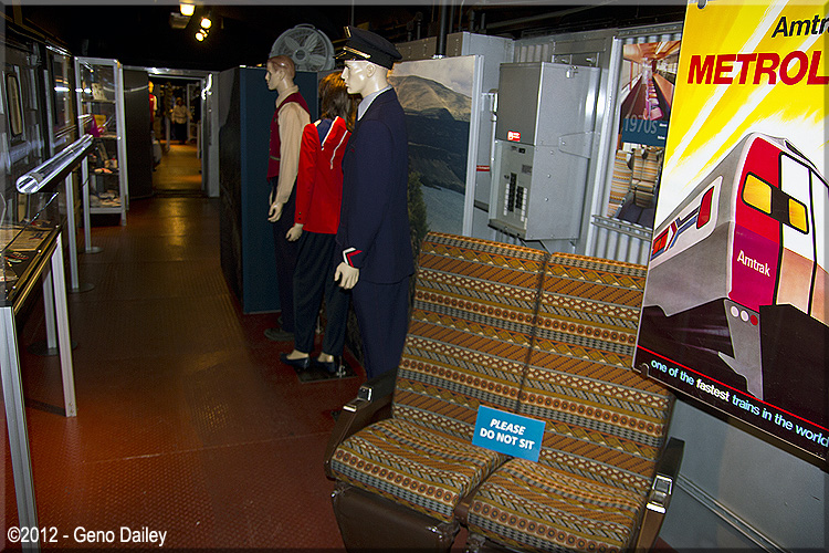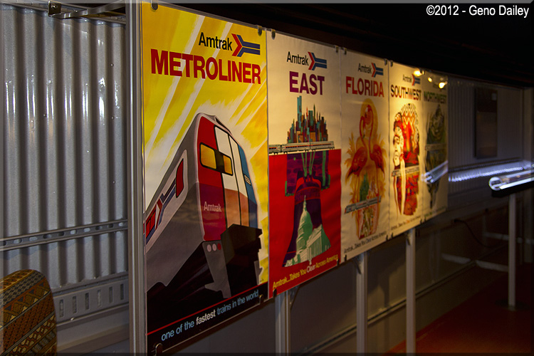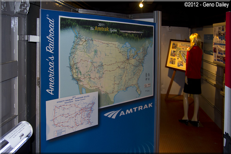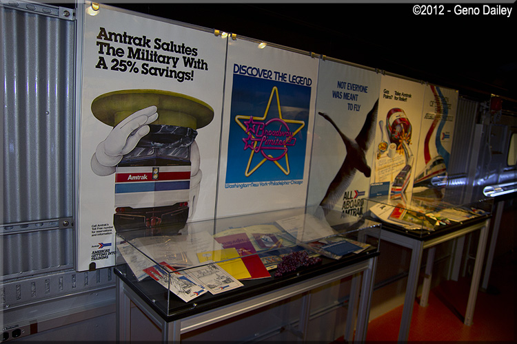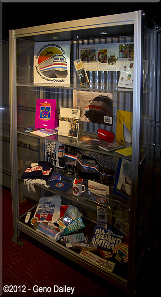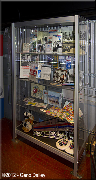 on my desk at home) along with some frisbees! RIGHT: Another display case with more Amtrak history! |