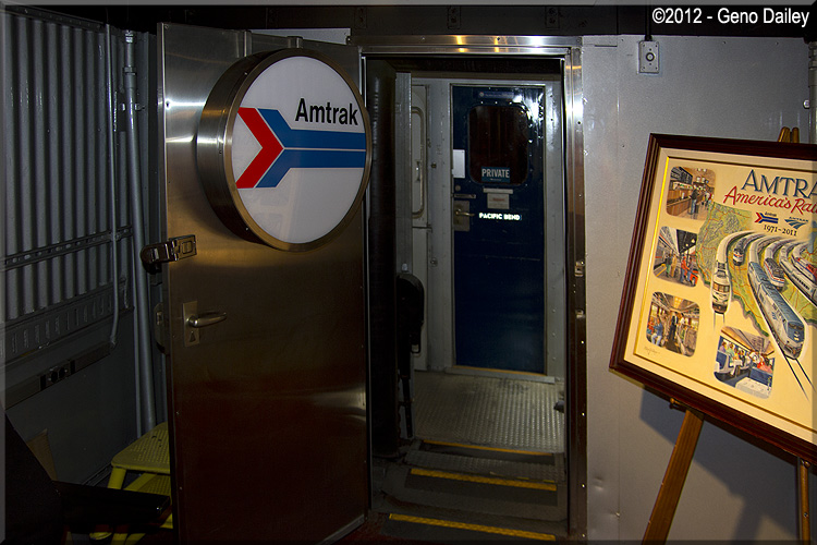 I wish all Amtrak trains had a drumhead like the one on the door of this car! The car connected to this one was the sleeping car