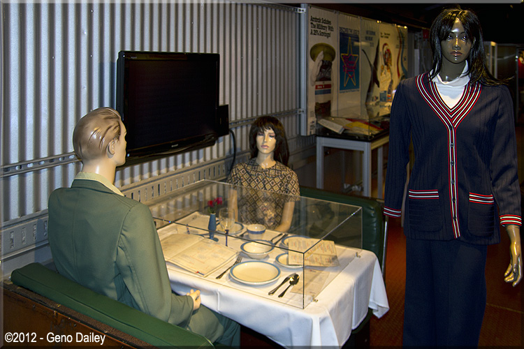 | An example of 1970's era dining car china dinnerware with an example of a 1970's era dining car uniform. |