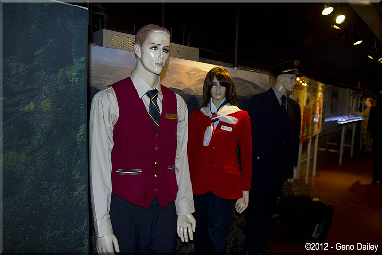 | Some early onboard service uniforms. Note the band-aid on the forehead of the male mannequin! |