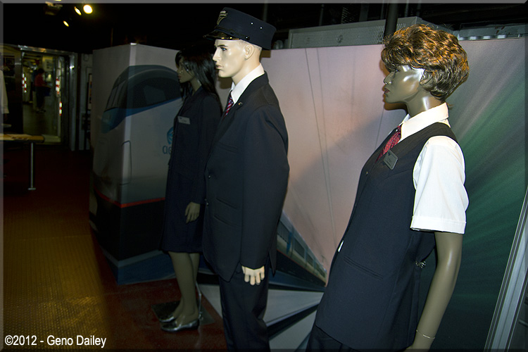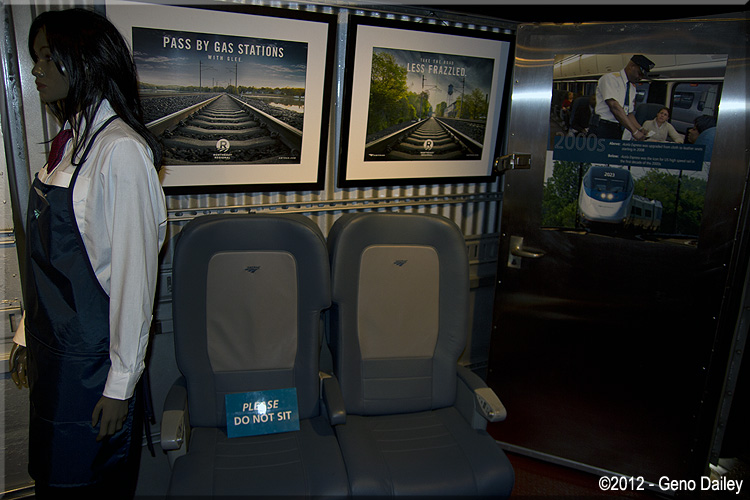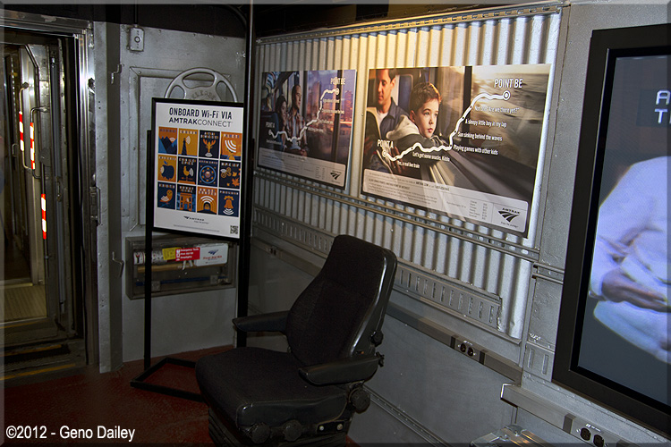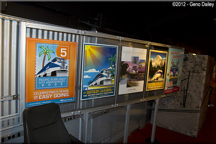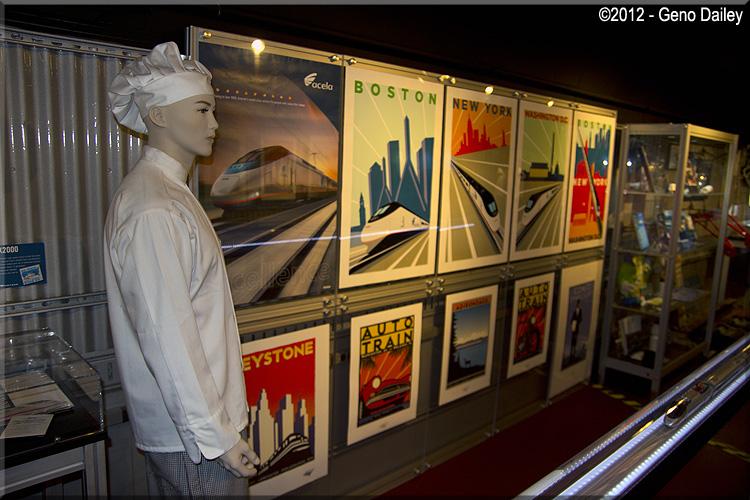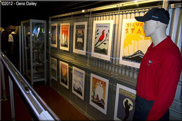 | A Baggage Handler uniform with posters of several routes (many of which I've covered in over 50,000 miles of riding Amtrak!). |
