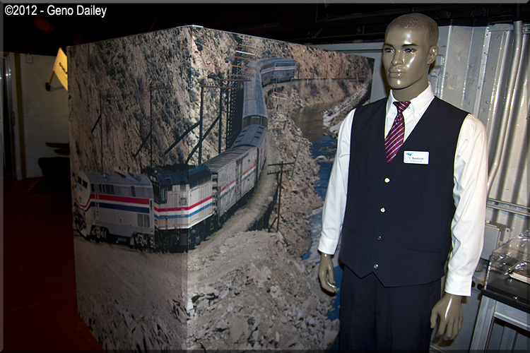 | A modern era onboard service uniform with what looks like the California Zephyr on the oversized poster in the background. |