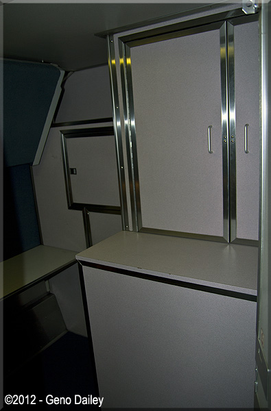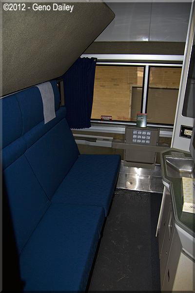 LEFT: A small office on the upper level of a Transition Sleeper. RIGHT: A Roomette with the top bunk set up