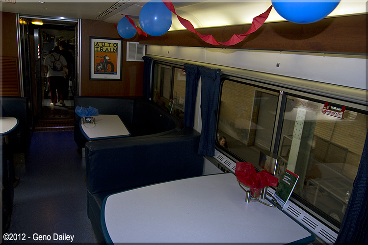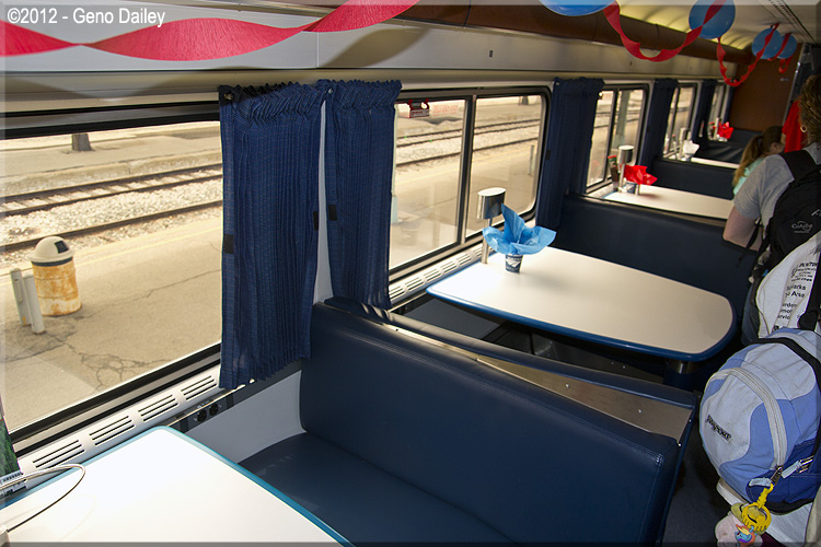 | Dining car tables inside a Superliner Diner/Lounge car. |