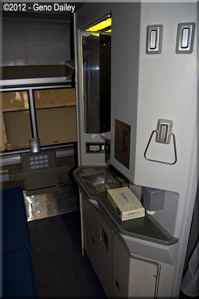 LEFT: A Superliner Bedroom set up for daytime use. RIGHT: The private vanity in the Superliner Bedroom. This car also features a