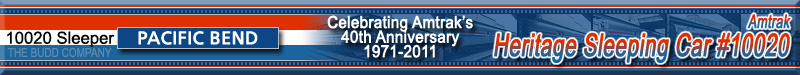 Former 10/6 sleeper for the Union Pacific. Conveyed to Amtrak in 1971, the car operated as a sleeping car and later a crew sleeper before being stored in 2006. The car was reactivated for use by the Amtrak Police in 2007 and renamed "Pacific Command". The car was renamed back to "Pacific Bend" when selected for the Exhibit Train. Historical Information here provided by Amtrak. |