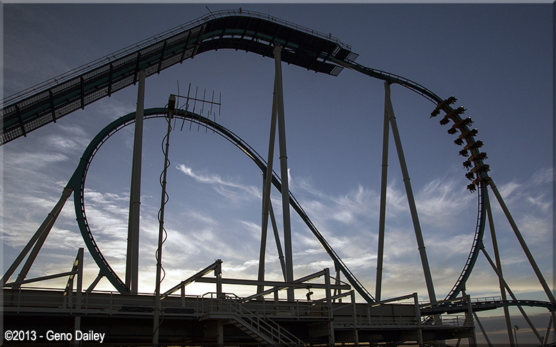 Taken shortly after sunrise, GateKeeper descends down its first drop! The TV antenna in the foreground was from one of many TV