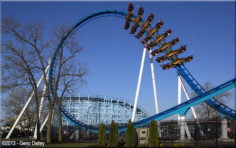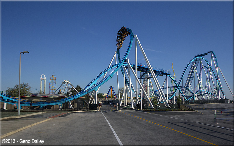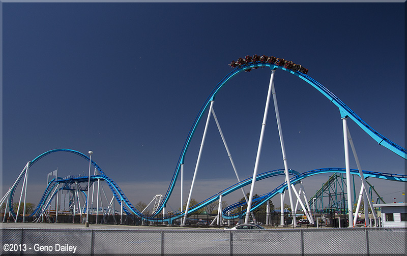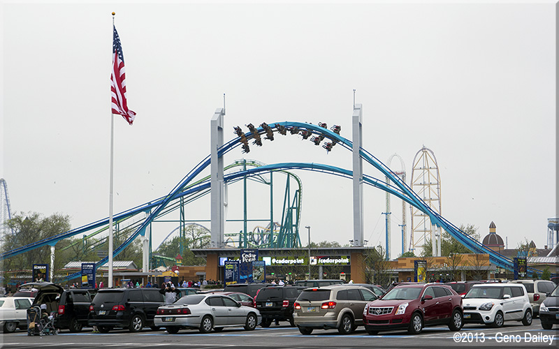 This is the far west end of the ride after passing over the front entrance gates. The coaster in the background is Blue Streak which