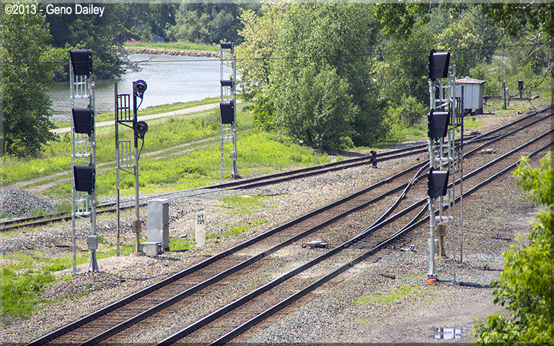 Walking along the tow path on the Erie Canal, you can see a view of the new signals. Having them turned to the side like this