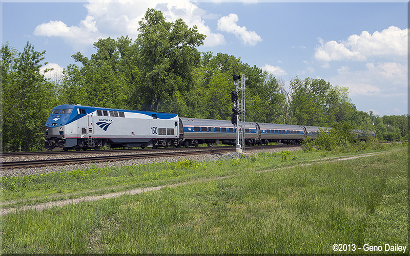 | Next up is westbound Amtrak Train #63 - The Maple Leaf with GE P42DC #150 leading. This train is headed for Toronto. |