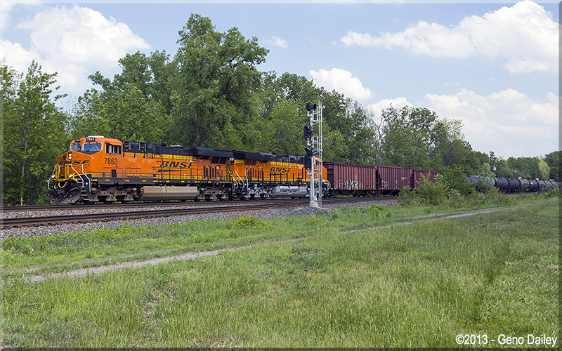 | And now, visitors from the west head through Fairport with CSX Train K-011 being lead by BNSF GE ES44DC #7863. |