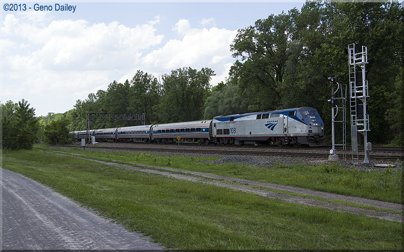 headed for New York's Penn Station with GE P42DC #103 on the head end as it flies through Fairport.