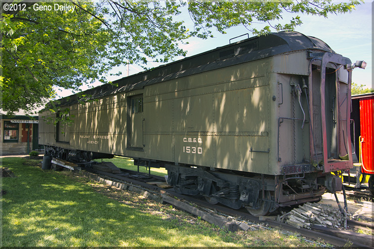 | Former Chicago, Burlington & Quincy Baggage Car #1530, a heavyweight car built in 1918. |