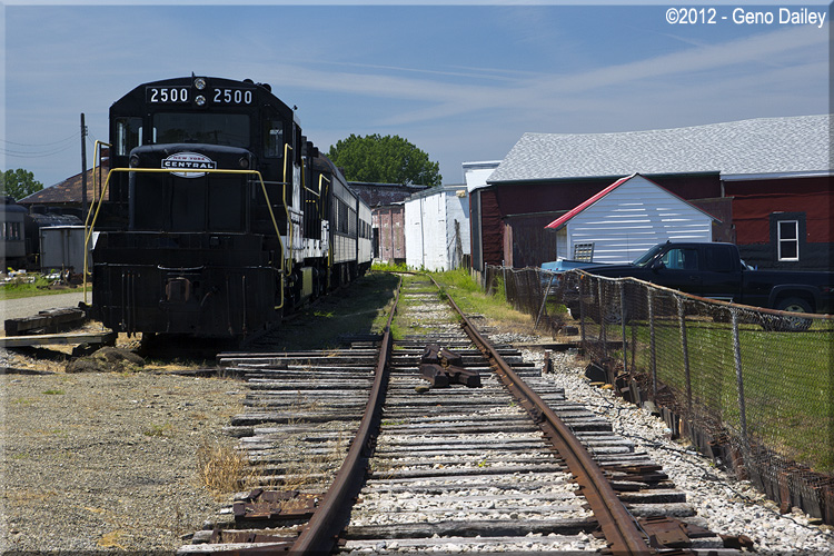| Now it's time to take a ride on a speeder! Departing the depot, we go past the museum's former New York Central GE U25B #2500. |