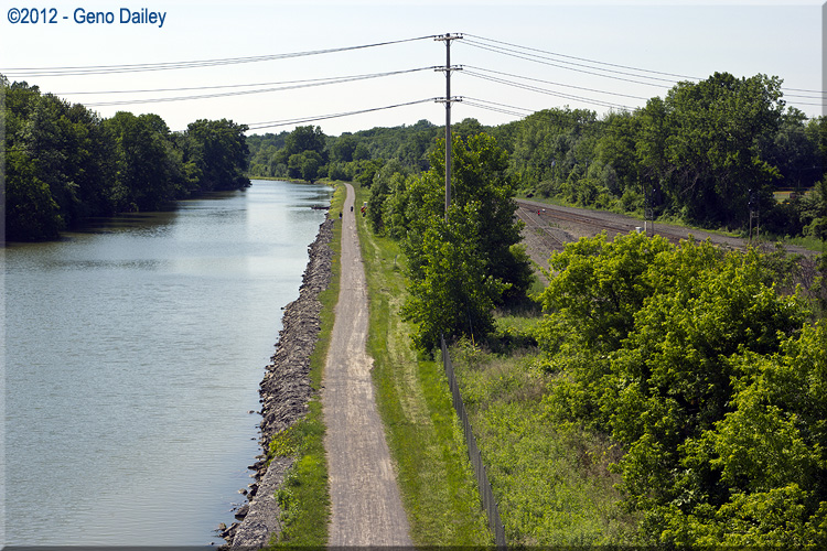 | After leaving Amtrak Rochester, I hopped back on I-490 and drove out to the Rochester suburb of Fairport at Lyndon Road where I parked my car at the entrance to a trail that runs along the canal. From there, I walked down a walkway to the towpath on the canal. The towpath of the Erie Canal today is used for biking and walking/running with the canal being a big tourist attraction throughout upstate New York. There are some good views of CP-359 where the West Shore Branch merges back with the mainline along the towpath. Below are a few photos taken during my brief stop at Fairport as I needed to get back to Downtown Rochester to get photos at the High Falls before this day was over. Enjoy... |