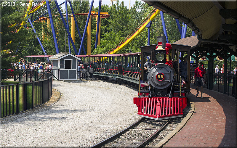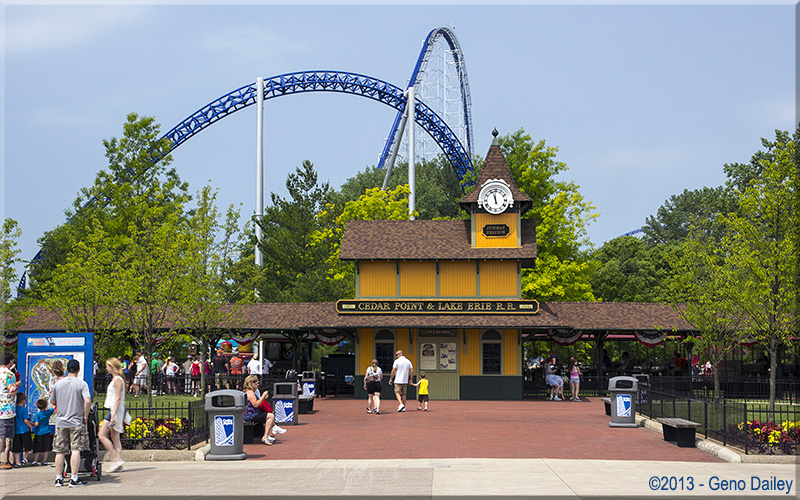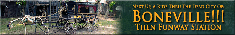 Originally opened in 1963 by former Cedar Point President George Roose, the Cedar Point & Lake Erie Railroad provides not only an easy way to get from the Main Midway to Frontiertown and return, but also is a nice relaxing ride featuring views of Sandusky Bay and several of CP's incredible roller coasters! It also features a visit to the small town of "Boneville". Boneville's claim to fame is everyone that lives there is well, dead!!! The town is populated with skeletons at different businesses that include everything from an undertaker, a blacksmith, a lumber mill, and lots of other goofy businesses! This train not only gets you to different places in the park, but will also make you laugh as well, and has been doing so for the last 50 years! If you head up to the top of the Main Midway, you'll see the Funway Station which is where you'll board the train. Included here are a collection of photos that cover a nice ride on the CP&LE from the Main Midway to Frontiertown, and don't worry, you'll see "Boneville" a little later as well. Enjoy... |