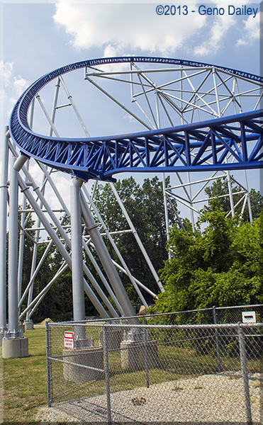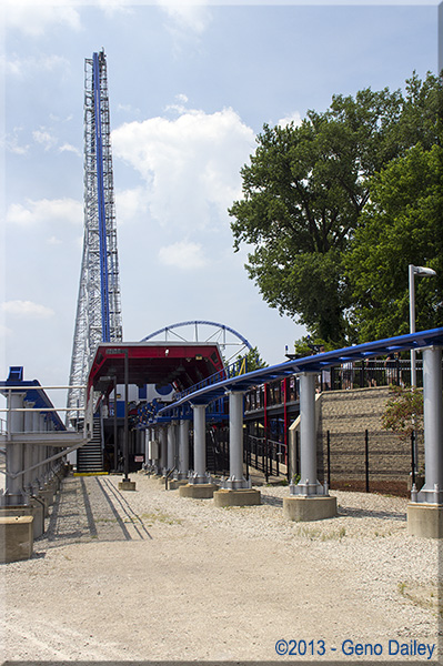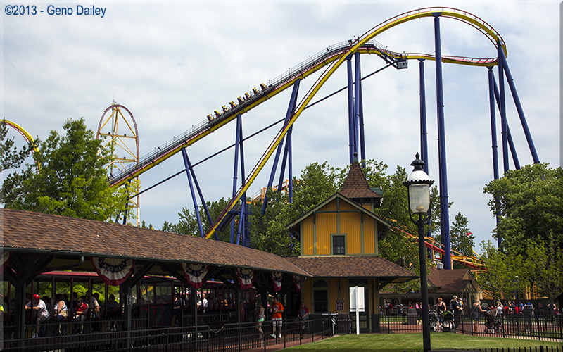 Two views of the first of four roller coasters that the CP&LE runs next to, this one being the 310ft-tall "Millennium Force" coaster. I have