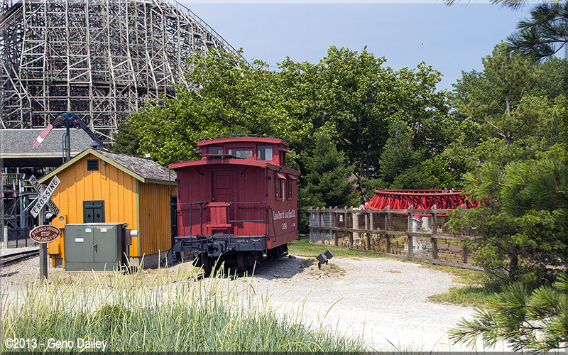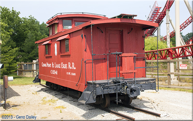 | A closer view of CP&LE Caboose #C-2341 located near the Maverick coaster. |