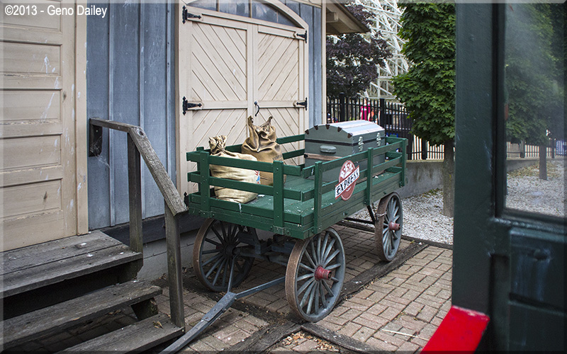A Railway Express Agency cart loaded with some freight waiting to go on the next freight train outta Frontiertown, so to speak!