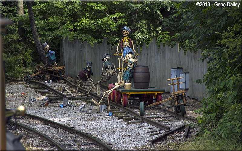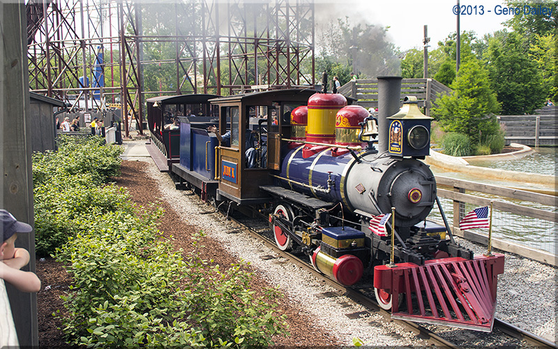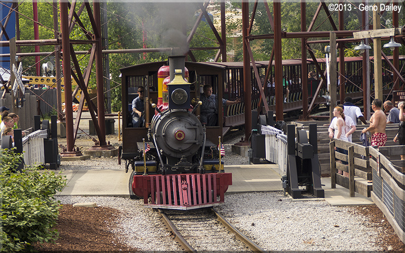 | Now departing Frontier Town Station crossing the access way to the Mean Streak coaster. |