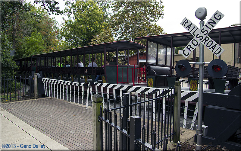 | Now crossing the access road to Shoot The Rapids, the CP&LE transports a group of passengers back to the Funway Station. |