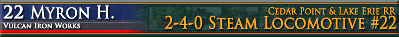 Originally built in 1922, it was sold to Stone & Webster Co. in 1926. In 1927, it was sold to Birmingham Rail & Locomotive Products in Birmingham, AL, then sold to Shook & Fletcher Supply Co. in Champion, AL. By 1941, it was sold to Standard Coated Products in Hepzibah, GA, then sold to Merry Brothers Brick & Tile Co. in Augusta, GA in 1945. By 1960, it was sold to Charles Weber in Archbold, OH and would be sold to Cedar Point in 1963. Cedar Point rebuilt the engine which was originally built as an 0-4-0T, into a 2-4-0. In 1981, it was given the name "Myron H." in honor of Mike Hetrick, former superintendent of the CP&LE. In 1990, it was rebuilt by Shop Services in Mt. Pleasant, IA and today serves as one of the two main locomotives on the CP&LE along with "Judy K.".