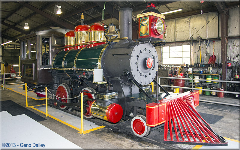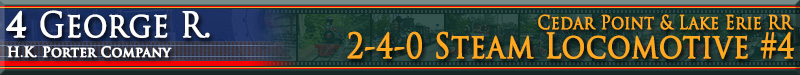 This is the CP&LE's "youngest" locomotive having been built in 1942. It was originally built with an 0-4-0T wheel configuration. In 1962, it was sold to Arthur E. LaSalle of the American Railroad Equipment Association. In 1963, it was leased to Cherokee Wonderland in Cherokee, NC. It was sold to Cedar Point in 1963 and rebuilt with its current 2-4-0 wheel configuration. Originally named "Victoria R.I.", it was renamed "George R." in 1981 after George Roose who was a former president of Cedar Point and the builder of the CP&LE. This is the heaviest locomotive on the CP&LE and the above photo was taken inside the railroad's shop building. |