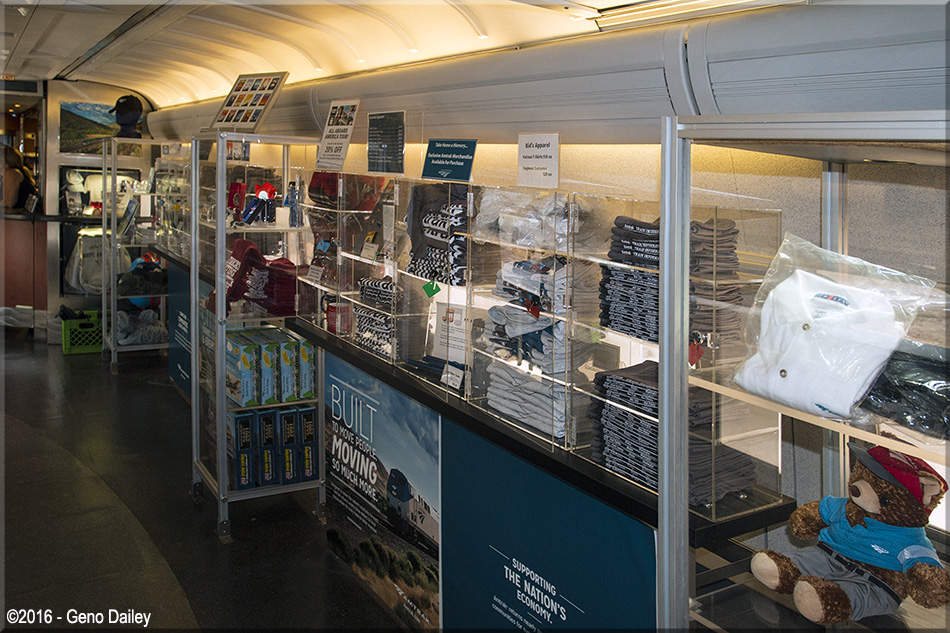 T-shirts, souvenirs and more await in the Exhibit Train's store car which is built inside an Amfleet I Café car. |