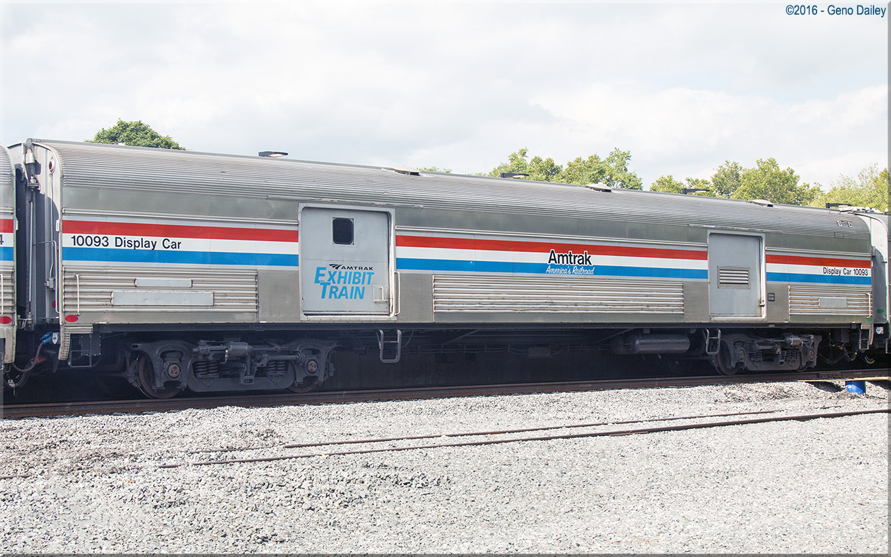 Built by Budd as a Baggage Car for the Atchison, Topeka & Santa Fe Railway in 1953 and numbered 3535. Conveyed to Amtrak in 1971 and numbered 1049. Converted to Head-End Power from Steam Heat in April 1978 and renumbered 1222. Stored dead in February 2007, the car was refurbished in April 2011, repainted into Phase III for use with Amtrak's 40th Anniversary Exhibit Train and renumbered 10093. Historical information about this car provided by www.amtrakbythenumbers.com. |