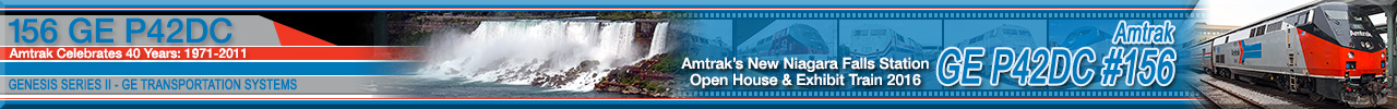 Built by General Electric Transportation Systems in March 2001 and numbered 156. This series of locomotives, also known as the Genesis Series II locomotives, were an upgraded version of the P40DC. Painted in Amtrak's original Phase I, this unit was the leader of the Exhibit Train when it visited Niagara Falls. This file photo is being used in this travelogue as this type of angle shown here was not available during the event. Historical information about this locomotive provided by www.amtrakbythenumbers.com. |