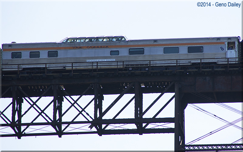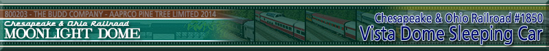 Built by Budd in 1948 as a Dome Sleeper for the Chesapeake & Ohio Railroad for the C&O's new train "The Chessie" which ended up never operating. The C&O assigned the number 1850 to this car. The car was then transferred to the Baltimore & Ohio Railroad and numbered 7600. The car was sold to the Seaboard Coast Line in 1969 and renumbered 6800 still keeping the same name. Conveyed to Amtrak in 1971 and renumbered 9200. Amtrak retired the car in November 1977. the Promontory Chapter of the National Railway Historical Society purchased the car in 2008 and the car has since been purchased by Birch Grove Inc. The dome can seat 20 guests for dining and there's a bar-lounge on the lower level. The Moonlight Dome has 3 large doubel bedrooms with single beds that fold down from the wall and a private toilet room in each bedroom. There is also a master bedroom with a double bed and a shower. Historical Information about this car provided by AAPRCO, amtrakbythenumbers.com, and Movie-Trains.com.