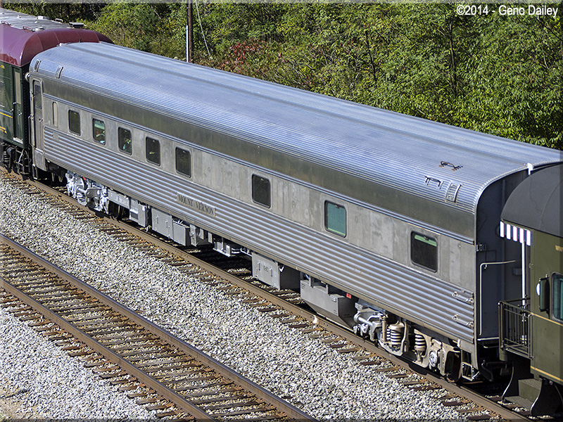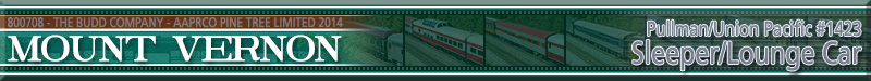 Built by Budd in 1950 for the Union Pacific Railroad as a 10 Roomette, 6 Double Bedroom Sleeper, named "Pacific Island" and numbered 1423. It was used in Pullman First Class service on the railroad. Conveyed to Amtrak in 1971, the car was renumbered 2617. This was one of the first cars Amtrak converted to Head-End Power from Steam Heat, having done so in May 1977 when the car was renumbered 2917. The car operated on Amtrak until 1995 and was sold to current owner Dominion Rail Voyages in 1999. Under private ownership, the car undwerwent major upgrades including converstion to a 6 Double Bedroom Lounge configuration that was completed in 2002. It was renamed "Mount Vernon" in honor of George & Martha Washington's estate on the Potomac River. Historical Information about this car provided by AAPRCO and amtrakbythenumbers.com. |