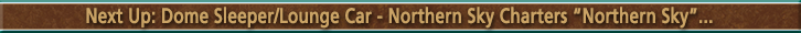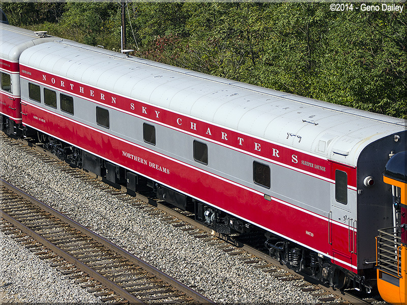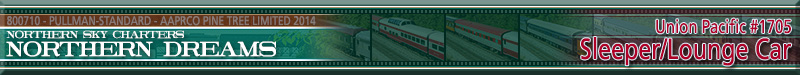 Built by Pullman-Standard in 1956 as a 5 Double Bedroom-Buffet-Redwood Lounge Car named "North Platte" for the Union Pacific Railroad. UP rebuilt the car into an 11 Bedroom Sleeper in 1965 and renamed it "Star Scene" and numbered it 1705. Conveyed to Amtrak in 1971 and numbered 2254. Converted to Head-End Power from Steam heat in April 1984 and renumbered 2234. Amtrak retired the car in 1997 and subsequently sold the car to current owners in 1999 when it was renamed "Northern Dreams". In 2003, the car was upgraded and refurbished as a 6 Bedroom Lounge. Historical Information about this car provided by AAPRCO, amtrakbythenumbers.com, and Movie-Trains.com. |