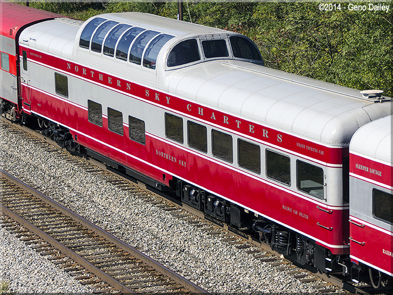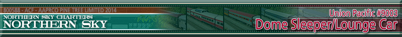Built by American Car & Foundry in 1955 for the Union Pacific Railroad and numbered 9003. The car seated 24 in low-backed divans in the dome. On the main level, a card room at the head of the car seated 5. There was room for 9 in a cocktail lounge which also had a bar, beneath the dome. Seating capacity in the observation lounge was 19. Just 1 year after this car went into service, all 15 observation cars of this type were reconfigured for mid-train service. In 1992, the current owner purchased and rebuilt the car which accomodates 14 for dining and entertaining in the dome. Historical Information about this car provided by AAPRCO. |