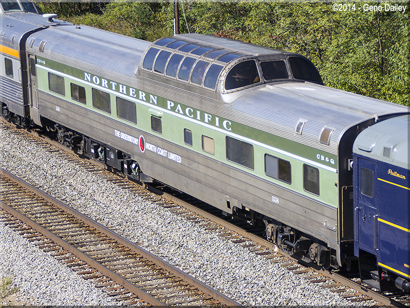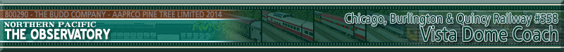 Built by Budd in 1954 as a Dome-Coach for the Northern Pacific Railway (wears reporting marks for the Chicago, Burlington & Quincy Railway) and numbered 558. The car was used on the Chicago-Seattle "North Coast Limited". Conveyed to Amtrak in 1971 and renumbered 9485. Converted to Head-End Power from Steam Heat in June 1983 and renumbered 9406. Amtrak placed the car up for sale in April 1995. Rail Adventures Inc. acquired the car in 1995 and made mechanical upgrades in 1996. The galley, lounge and a master bedroom were completed during 1998. 2 deluxe bedrooms and a porter's room were added in 2000. The car has a master bedroom with queen-sized bed, 2 deluxe bedrooms with full-size double beds, two showers, a porter's room, kitchen for full meal service and a washer and dryer. In addition, the lounge has a queen-sized sleep sofa for additional guests or family members. Historical Information about this car provided by AAPRCO and amtrakbythenumbers.com. |