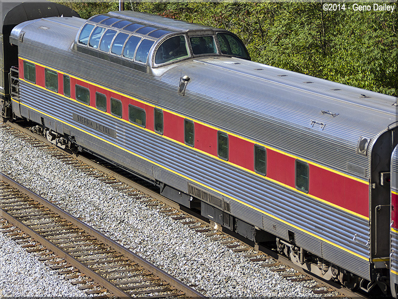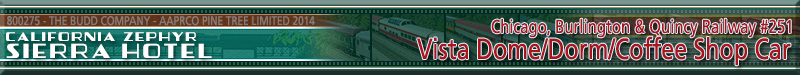 Built by Budd in 1948 for the Chicago, Burlington & Quincy Railway for use on the "California Zephyr" as a Dome-Dormatory-Coffee Shop car that provided overnight accomodations for the train's staff. The car was originally named "Silver Lounge". Conveyed to Amtrak in 1971, and renumbered 9811, it would operate on Amtrak until 1980 and would subsequently be retired in October 1981. The car would end up in private ownership under the Vandalia Railroad and would eventually be sold to its current owner who would do a complete rebuild of the car. The dorm was replaced with bedrooms, the coffee shop replaced with an observation lounge and an open platform was added. The dome now seats 16 for lounge and dining service. Historical Information about this car provided by AAPRCO & amtrakbythenumbers.com.