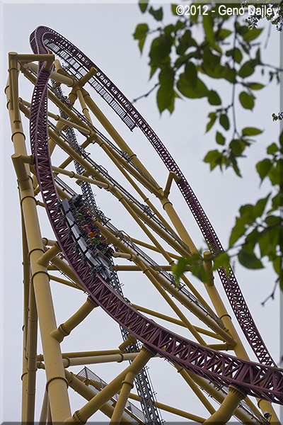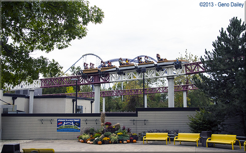 In the above pair of 2012 views of the ride, we see one of the trains about to enter and just after passing through the ride's