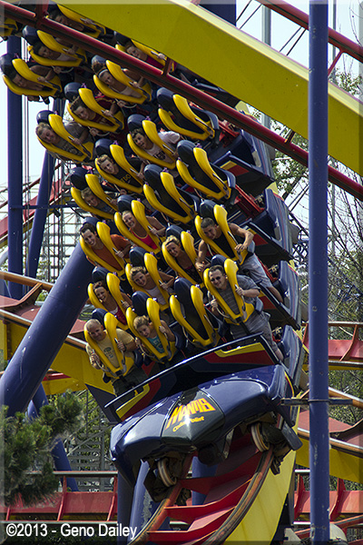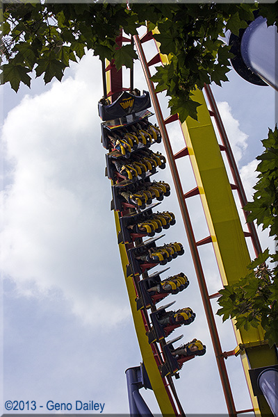 | A couple views of Mantis, a 1996-built coaster (also by Bolliger & Mabillard) that has you riding while standing up! |