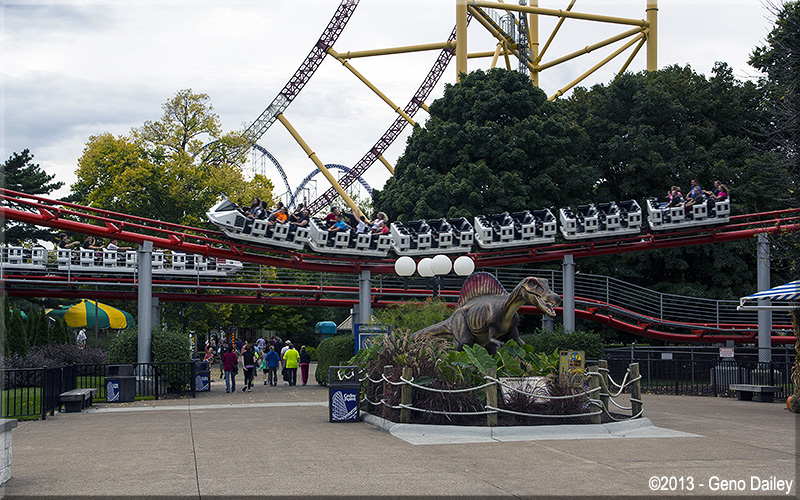 towards the right (the one in the background) has just left the loading platform with thrill seekers about to take a great ride!!! A dinosaur