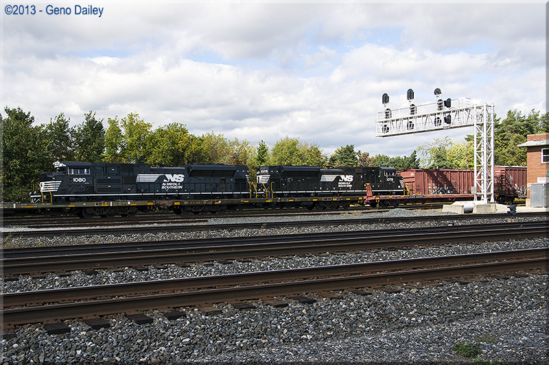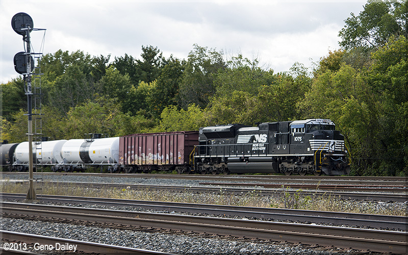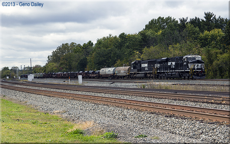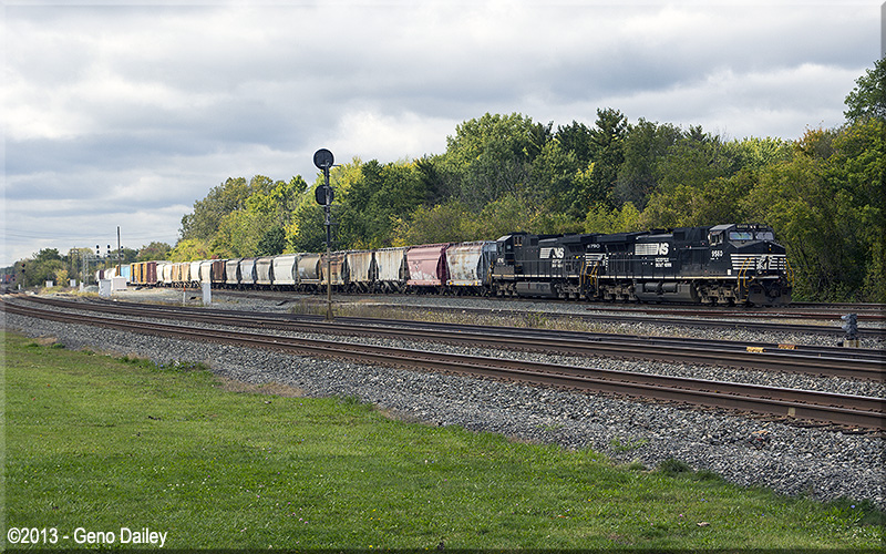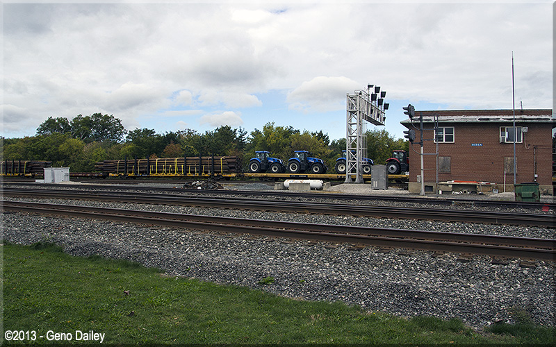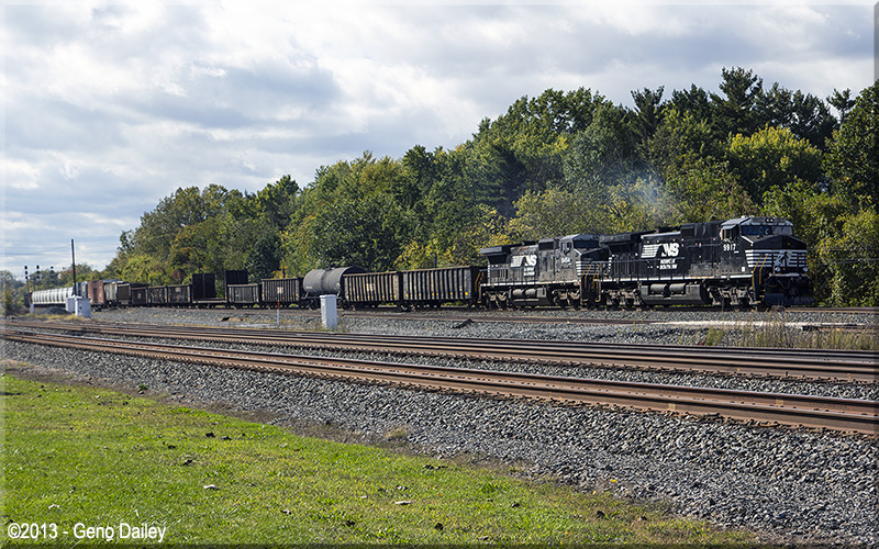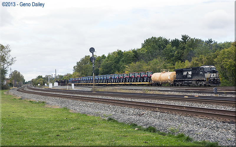 | The first train today was this eastbound NS carrying a fleet of new Case tractors pulled by GE C40-8W #8391. |