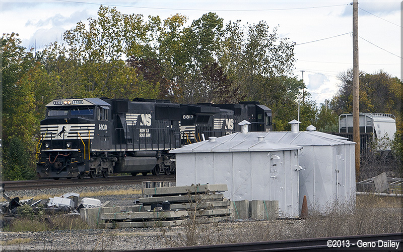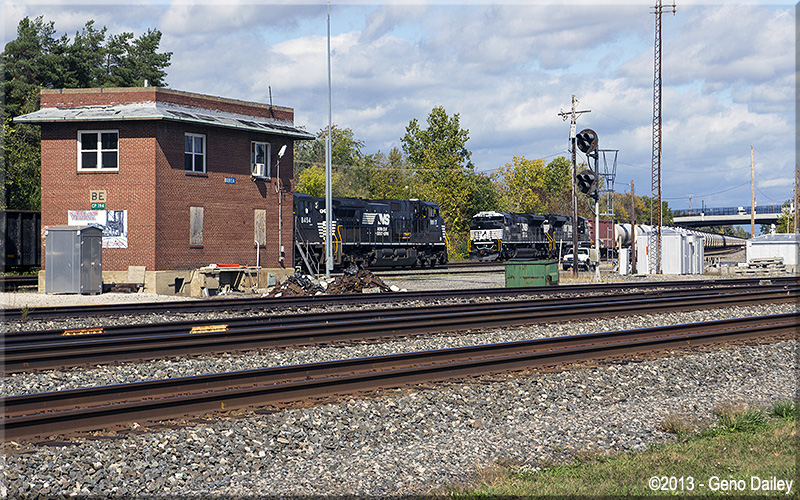 | Hiding behind Train 14N's cars is NS Train 65R with 2 EMD SD70ACe's with #1080 leading, heading west. |
