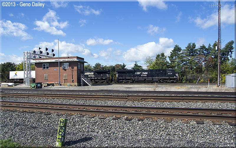 Two NS freights passing each other near the tower. Unfortunately, it was tough to hear train symbols on the