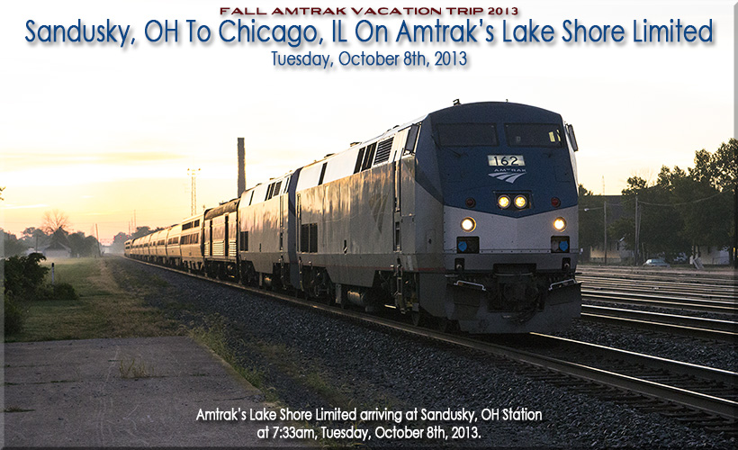 At 7:35am, running 2 hours and 40 minutes late, we departed Sandusky, OH. After putting my bags in the area of the coach where there was room (as the overhead racks were full), I took window seat #43 in Amfleet II Coach #25039 and wasted no time in beginning to find new photo opportunities that opened up because of the lateness of this train, such as seeing the sun rise over Sandusky Bay with Cedar Point in the background, how cool!!! I spent the rest of the time between Sandusky and Toledo taking a ton of pictures and at 8:26am, running 2 hours and 31 minutes late, we arrived in Toledo, OH. As I said at the beginning of this travelogue, I would be upgrading to a sleeping car once at Toledo as that was the zone cut-off for Amtrak Guest Rewards and it didn't cost me any more points to upgrade here verses Chicago. I just had to now walk from my coach in the Boston Section to the second to last car in the train in the New York Section as I was now ticketed in Roomette #4 in the 4912 car which today was Viewliner I Sleeper #62002 "Autumn View". The train also got a new crew and passengers could get off the train and smoke if they wanted. I brought my bags into my sleeping car and at 8:43am, now running 2 hours and 28 minutes late, we departed Toledo.